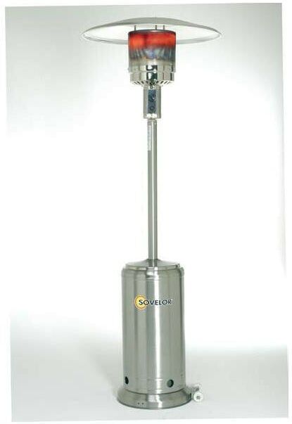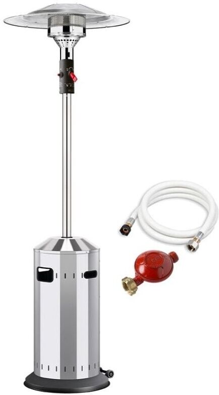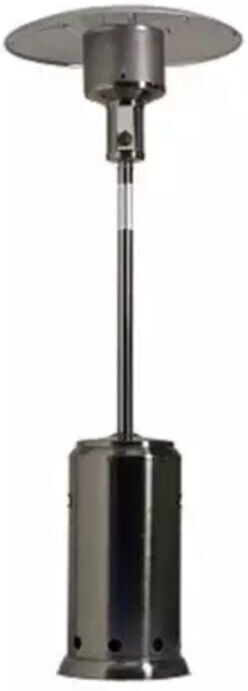 Parasol chauffant en inox gaz propanne 3 8 kW avec allumage piezo, pour une utilisation en extérieur. Caractéristiques : Capacité de chauffe : 20m² Puissance : 3 8 kW Dimensions : 230x60 cm Container et mât en Allumage par électrique Réflecheur aluminium de Ø 79 cm Chaleur propre Mobile (pas d'alimentation électrique) réglable Anti basculement Double sécurité Avec 2 roulettes de déplacement Autonomie : de 14h à 35h Poids : 17 kg